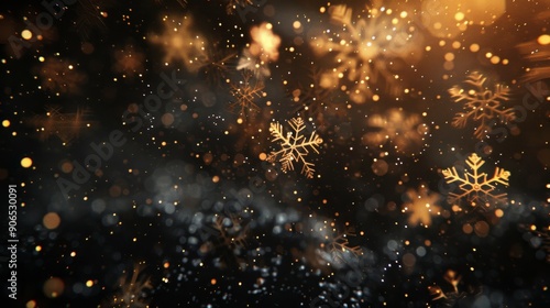 © Digital Dreamscapes, Fototapeta premium Bokeh lights with glittering golden light effects and falling snowflakes on a black background. Perfect for elegant designs with copy space for text.