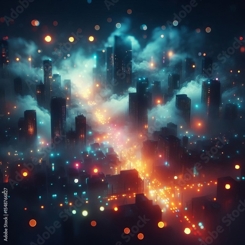 © Alexei, Fototapeta premium Bokeh with neon fog—bright light spots in thick fog urban and