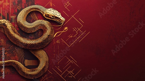 © P.G, Obraz premium Bold and modern Chinese New Year wallpaper with a golden snake design, geometric patterns, and subtle zodiac elements on a deep red canvas.