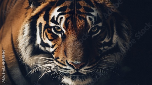 © Thanthara, Naklejka premium Bold and powerful tiger portrait eyes glowing in soft ambient light deep shadows adding moody intensity cinematic wildlife frame