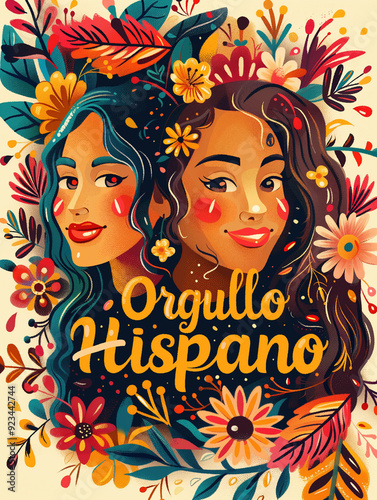 Naklejka premium Bold and vibrant illustration with Orgullo Hispano text and floral elements,...
