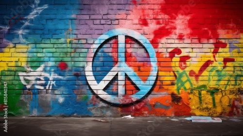 Fototapeta premium Bold Anti-War Statement: Symbol of Peace Amidst Graffiti Art. In the midst of a graffiti wall adorned with colorful blocks of paint, a striking anti-war symbol is painted prominently in the center.