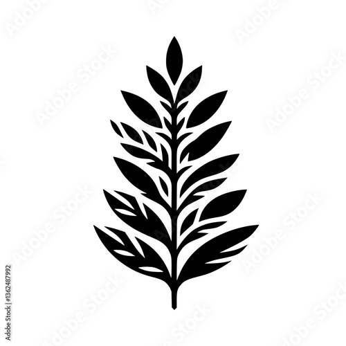 Fototapeta premium Bold Black Silhouette of a Detailed Leafy Branch on a Clean White Background, Highlighting Nature's Geometric Beauty.