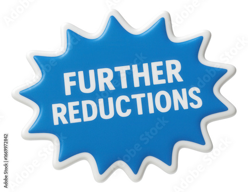 © stickerside, Fototapeta premium Bold blue burst sticker with FURTHER REDUCTIONS offer in white lettering, vibrant retail discount promo on transparent background.