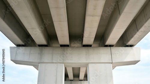 © Nasira Mai, Obraz premium Bold concrete bridge structure with repeating geometric patterns against a soft sky