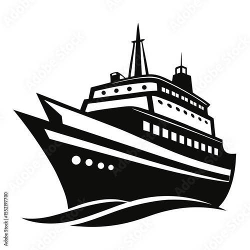 Obraz premium Bold Cruise Ship Icon Sailing on Waves, Maritime Adventure, Black and White