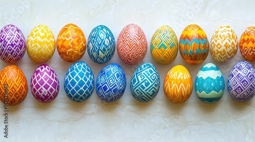 Fototapeta premium Bold geometric patterns on brightly colored Easter eggs laid out in zig-zag...