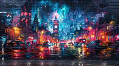 © Kristian, Fototapeta premium Bold Graffiti-Style Mural of Bustling Cityscape at Twilight
