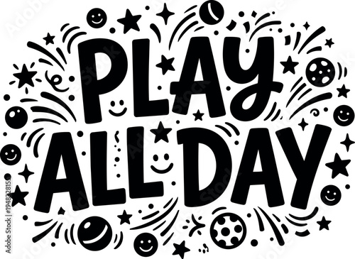 Obraz premium Bold hand drawn lettering play all day with playful stars balls and smiley faces decorative elements vector art