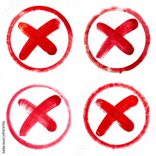 Obraz premium Bold hand painted red X cross mark inside a circle rough brush strokes...