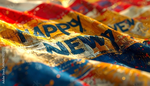 Fototapeta premium Bold ‘Happy New Year’ Painted on Parade Banner with Fabric Weave and...