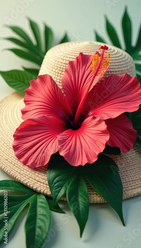 Naklejka premium Bold hibiscus blooms & palm leaves on a sun hat , hibiscus, trendy