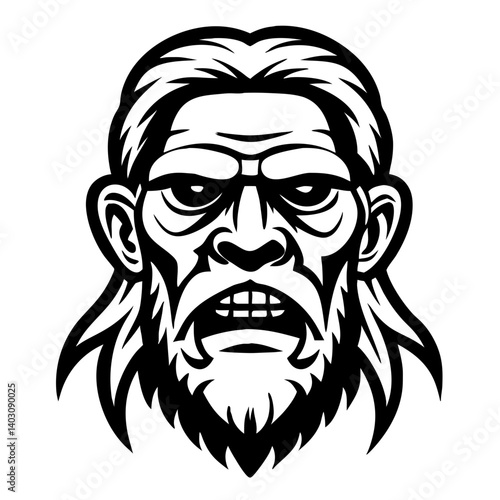 Fototapeta premium Bold Monochrome Illustration of an Aggressive Bearded Warrior Head for Tattoo and Graphic Design