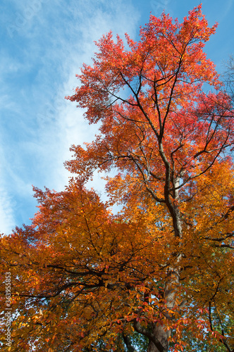 Fototapeta premium Bold orange and red colored tree in Autumn with a blue sky.