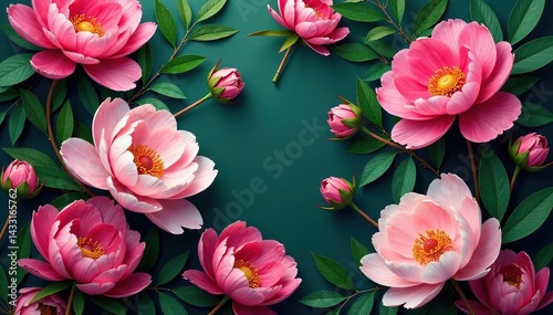 © Nopadon, Obraz premium Bold peony blooms, lush green foliage, damask-style repeat, black, bright