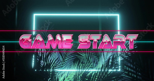 © vectorfusionart, Obraz premium Bold pink neon GAME START sign glowing in retro-futuristic digital set, with neon and palm fronds