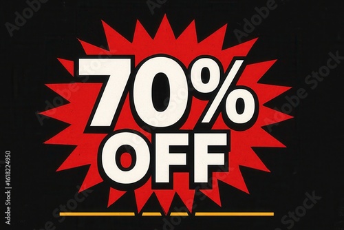 © stickerside, Fototapeta premium Bold promotional graphic displaying "70% OFF" in large white text on a red starburst background against a black backdrop, indicating a significant discount.