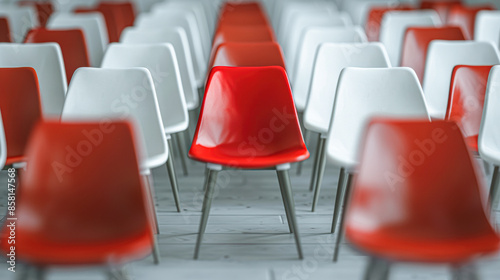Naklejka premium Bold Red Chair Making a Statement in a Sea of White Chairs
