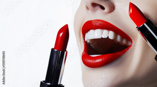 Obraz premium Bold red lipstick on a smiling woman's mouth with bright white teeth,...