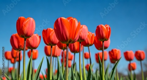 Fototapeta premium Bold red tulips against a blue sky.jpg
