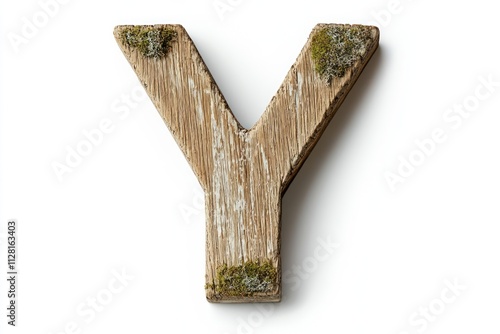 Fototapeta premium Bold rustic wooden capital letter Y, aged oak wood, moss growing in crevices, white background