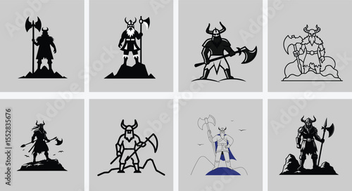 © Guljahan, Naklejka premium Bold Silhouette of Viking Warrior Holding Axe Nordic Warrior Art Illustration