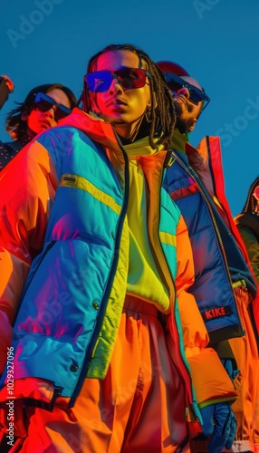 Fototapeta premium Bold Streetwear Promotion Featuring Models in Vibrant Outfits for a Dynamic...