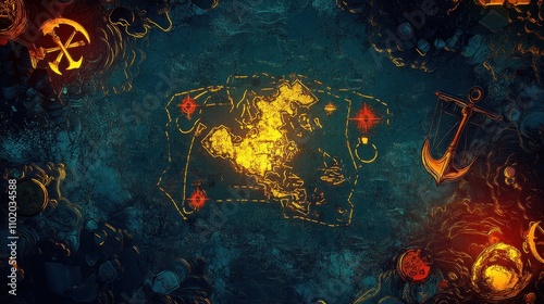 Obraz premium Bold treasure map glowing with pirate symbols and swirling light effects