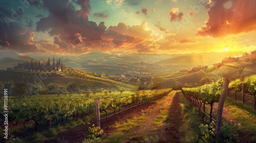 Naklejka premium Bolgheri vineyard with views over the hills and beauty at sunset. Trees as a...