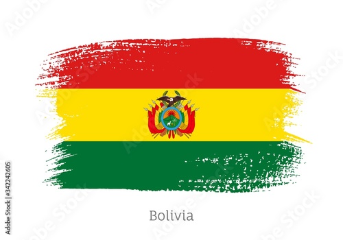 © Sunflower, Obraz premium Bolivia republic official flag in shape of paintbrush stroke. Bolivian national identity symbol for patriotic design. Grunge brush blot vector illustration. Bolivia country nationality sign.