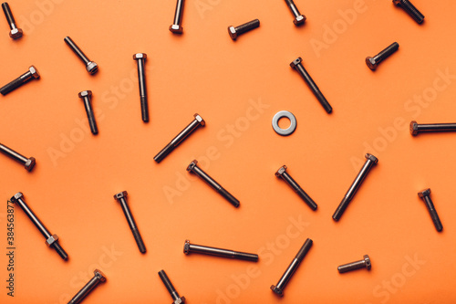 © Julia, Naklejka premium Bolts and nuts closeup on orange background.