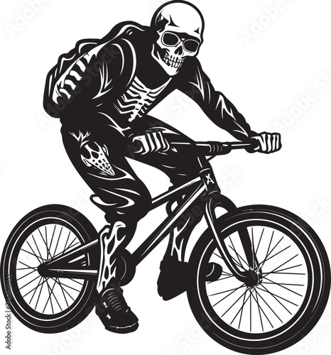 © BABBAN, Naklejka premium Bone Biker: Skeleton BMX Cyclist Black Icon Ramp Rattler: Skeleton Performing Stunts on BMX Cycle Black Logo