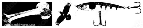 © Rysak, Fototapeta premium Bone with textured halftone, raven in flight silhouette, fishing lure with treble hooks, all vector flat, isolated graphic elements.