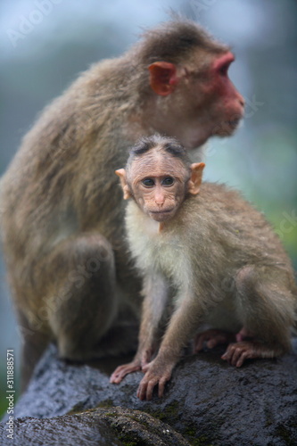 Naklejka premium Bonet Maquac, mother cleaning Young one, Western Ghats, Maharastara, India