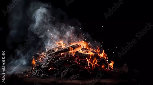 © Grycaj, Fototapeta premium Bonfire with red-hot coals. Smoke, sparks. On a dark background. Generative AI technology.