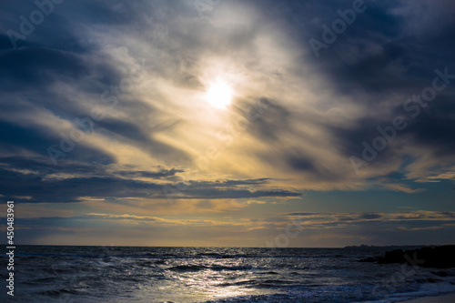 © Daniel, Fototapeta premium bonito atardecer en la playa con el mar y cielo azul con un sol amarillo