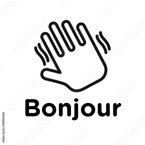 Fototapeta premium Bonjour text with hand wave icon Black line art vector logo