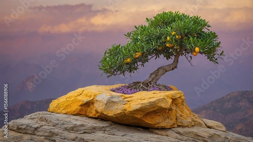 © Borasca, Obraz premium Bonsai orange tree on rugged rock with scenic mountain view at sunset