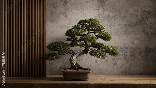 © The 2R Artificiality, Fototapeta premium Bonsai tree positioned near a wooden wall, enhancing natural aesthetics