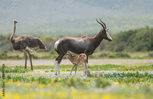 © Childa, Fototapeta premium Bontebok (Damaliscus pygargus pygargus) adult and calf or baby suckling or nursing in Spring flowers at De Hoop nature reserve, Western Cape, South Africa