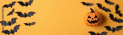 © nunoi, Fototapeta premium Boo with jack-o-lantern face, playful bats flying around, orange background