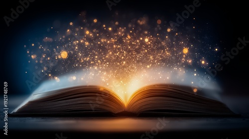 © kl yanii, Obraz premium Book is open to a page with a bright light shining on it. The light is creating a glowing effect around the book