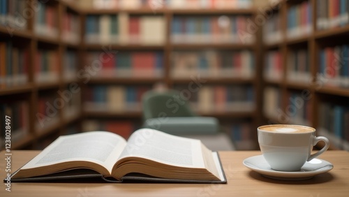 © Nima, Naklejka premium Book Mockup with Coffee, Library background open book cappuccino photorealistic no blur