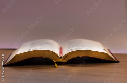 Fototapeta premium Book. Opened. Isolated. Desk. Wood. Pencil