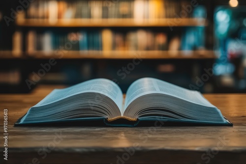 © Dzikrul Husnani, Fototapeta premium book with open pages, close up, books on the shelf in school, open book on wooden table. back to school concept, ai