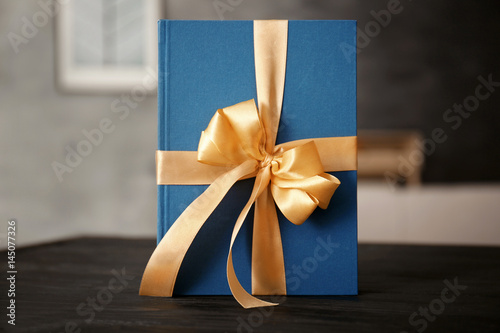 Naklejka premium Book with ribbon as gift on wooden table