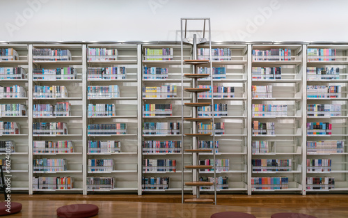 © Jitti, Fototapeta premium Bookcases with ladders in the library. Blur background.
