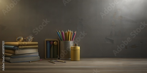 © Pablo Kluba, Obraz premium Books and pencil holder with assorted colorful pencils set against a soft grey background with copy space, symbolizing school supplies organization