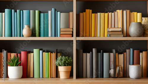 Fototapeta premium Books Arranged on a Modern Wooden Bookshelf, Representing Knowledge, Education, and Interior Design Inspiration for Home Library Decor