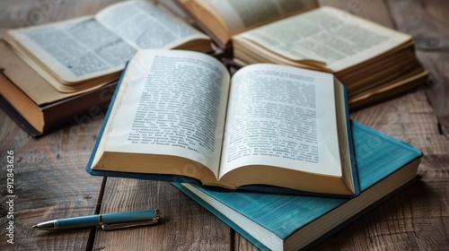 Fototapeta premium Books lay flat with an open book, pen, and notepad.